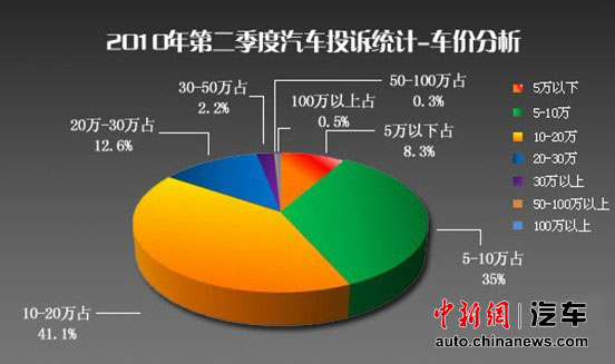 在2010年二季度中,5萬(wàn)以下車(chē)型投訴量上升1.9%,5-10萬(wàn)車(chē)型投訴增長(zhǎng)8.2%,可見(jiàn),10萬(wàn)以下車(chē)型同比增長(zhǎng)超過(guò)10%。主要問(wèn)題包括怠速不穩(wěn)、維修多次修不好以及問(wèn)題責(zé)任鑒定等。