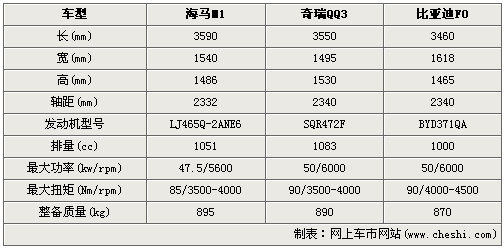 從上面的參數(shù)對(duì)比不難看出,海馬M1車身長(zhǎng)度比QQ3、F0略大一點(diǎn),車寬在兩款車之間,而軸距要比QQ3、F0小了一點(diǎn)點(diǎn)。在動(dòng)力上,海馬M1搭載柳汽的LJ465Q系列1.0L發(fā)動(dòng)機(jī),最大功率47.5kw,最大扭矩85牛米,與QQ3的1.1L、F0的1.0L發(fā)動(dòng)機(jī)相比,至少在數(shù)據(jù)上要遜色一點(diǎn)。