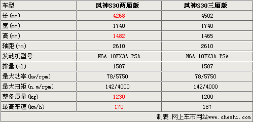 風神S30兩廂版在尾部的車身結構上有明顯變化,所以整車的參數(shù)也會隨之改變。通過與三廂車型的參數(shù)對比發(fā)現(xiàn),風神S30兩廂版的車身尺寸有了明顯變化,其中長度縮短了234毫米,高度則增加了17毫米。雖然外形尺寸有明顯變化,但風神S30兩廂版的軸距并無改變,保障了后排的空間優(yōu)勢。風神S30兩廂版依然采用PSA 1.6L發(fā)動機,但整備質(zhì)量增加了30公斤,多少會影響整車的動力性能,最高車速只能達到170公里每小時。