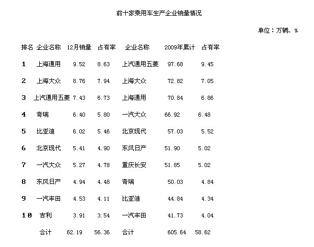 數(shù)據(jù)顯示,受益于上汽通用五菱、上海大眾、上海通用的聯(lián)合發(fā)力,上汽去年銷量同比增長(zhǎng)了57.23%,其中,生產(chǎn)微型車的上汽通用五菱貢獻(xiàn)了97.68萬(wàn)輛的銷量,同比增長(zhǎng)66.68%,為上汽鞏固霸主立下了巨大戰(zhàn)功。同樣受惠于購(gòu)置稅減征和汽車下鄉(xiāng)雙重利好、以微型車為主的長(zhǎng)安汽車,在整合了昌河、哈飛等微型車企業(yè)后,銷量大增至186.98萬(wàn)輛,縮小了與其他“三大”的差距,并拉開(kāi)了與“四小”的銷量差距。東風(fēng)的銷量則是因旗下的神龍汽車、東風(fēng)悅達(dá)起亞和東風(fēng)日產(chǎn)在2009年均獲得50%以上的增長(zhǎng),公司整體銷量才保持了43.70%的增幅。