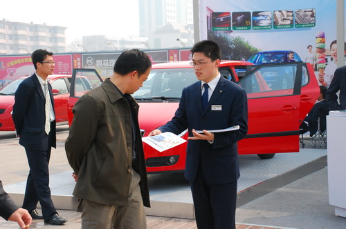中新網(wǎng)4月19日電在2009(第六屆)全國百強縣市汽車巡展壽光站的現(xiàn)場筆者發(fā)現(xiàn)了這樣的一幕,與其他廠商不同,上海大眾斯柯達的經(jīng)銷商濰坊天和汽車銷售服務(wù)有限公司的銷售人員,不但在展位為前來咨詢的消費者進行講解,而且還走出展位,走到展位外面為消費者講解,吸引消費者來了解更多車輛信息。