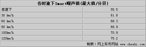 也許有人會(huì)擔(dān)心smart這么小的車(chē)隔音和密封性是否有問(wèn)題,為此我們?cè)诒本┍彼沫h(huán)路中關(guān)村附近進(jìn)行了測(cè)試,在車(chē)外我們測(cè)得了最高77分貝的環(huán)境噪聲;而當(dāng)我們進(jìn)入到車(chē)內(nèi)噪聲指數(shù)立即下降了22分貝之多,55分貝的水平幾乎達(dá)到了辦公室的安靜程度。
