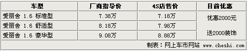 據(jù)4S店銷(xiāo)售人員介紹:目前新愛(ài)麗舍最高優(yōu)惠達(dá)2000元,店內(nèi)另送2000元裝飾。目前新愛(ài)麗舍現(xiàn)車(chē)非常充足,顏色齊全,白色、銀色等暢銷(xiāo)的顏色可供挑選。