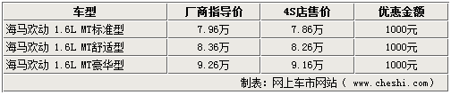 經(jīng)銷商表示,海馬歡動1.8L排量車型,最低配的手動舒適型售價8.76萬,最高配的自動(CVT)豪華型售價10.66萬,優(yōu)惠金額均為9千元,除現(xiàn)金優(yōu)惠外還會有相應(yīng)的裝飾贈送。現(xiàn)金優(yōu)惠配合購置稅優(yōu)惠,則大大減輕了消費者的購車負擔(dān)。