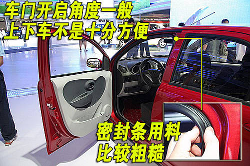 駕駛員一側(cè)車門完全打開后車門開啟角度有限,身材較高的用戶上下車會比較不方便。車門四周有橡膠密封條手觸感覺比較粗糙。