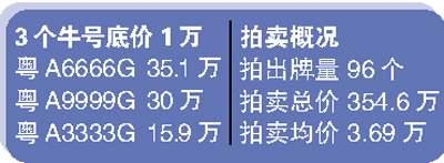 這次競拍會上最受矚目的無疑是粵A3333G、粵A6666G、粵A9999G三個(gè)底價(jià)1萬的四連號。最后,550號競拍者以35.1萬高價(jià)競拍粵A6666G成功,成為本場“標(biāo)王”。而上期標(biāo)王粵A6666G僅拍出16萬元。(記者譚德波)