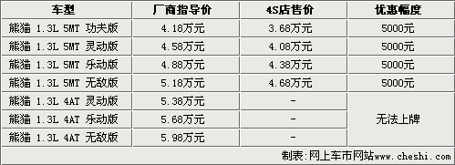 據(jù)吉利汽車4S店銷售人員介紹,熊貓1.3L手動(dòng)擋車型目前都有現(xiàn)車銷售,而自動(dòng)擋雖然已經(jīng)上市,但由于北京地區(qū)無法上牌,所以還沒有現(xiàn)車抵達(dá)北京市場,預(yù)計(jì)最早會(huì)在今年年底前解決無法上牌的問題。目前熊貓1.3L手動(dòng)擋全系可以優(yōu)惠五千元,而這款車型還增加了電動(dòng)升級(jí)后窗,需要在原價(jià)的基礎(chǔ)上加1000元。