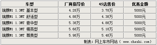 據(jù)奇瑞瑞麒4S店銷售人員介紹,目前瑞麒M1只在專屬瑞麒4S店內(nèi)銷售,其它奇瑞的4S店并沒有這款車的銷售權(quán),F(xiàn)在瑞麒M1精英版及1.0車型已經(jīng)到店銷售,店內(nèi)1.3L的M1車型已經(jīng)非常齊全,并且顏色較為豐富。目前購(gòu)買1.3L瑞麒M1現(xiàn)金方面可優(yōu)惠5000元。