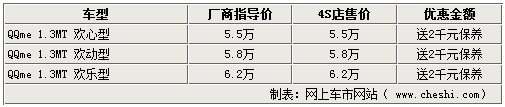 奇瑞在推出QQ家族的新成員QQme后,令經典的QQ全系車型再度引起消費者的關注。近日網上車市車市網站由經銷商處了解到,新上市不久的QQme雖然沒有現(xiàn)金優(yōu)惠,但是贈送價值2000元的保養(yǎng)卡。