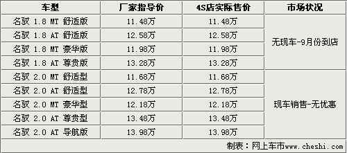 據北京地區(qū)現代4S店銷售人員表示,現在各4S店內均有MOINCA名馭2.0L現車銷售,由于是剛剛上市的新車,所以在價格方面沒有任何優(yōu)惠。至于1.8L車型,銷售人員則表示,1.8L車型要到9月份才能到店,目前接受現金預定。銷售人員還表示,1.8L的MOINCA名馭將主要面對出租車市場,所以客戶需要等待較長一段時間。