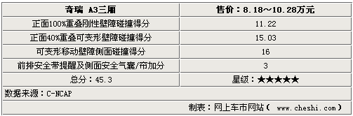 集A、B兩級優(yōu)點于一體的奇瑞A3,與A級車相比,更動感、更安全、更舒適,與B級車相比更超值、省油、省空間。在其身上,充分體現(xiàn)了B00級家轎的核心技術(shù)特征,可凝練為:5E4W!5’是指5星安全設(shè)計;‘E’是指ESP電子穩(wěn)定系統(tǒng);‘4’是指四連桿式后獨立懸架系統(tǒng),‘W’是指Wide(寬體)”。
