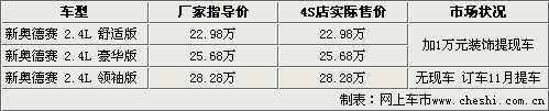 據(jù)北京地區(qū)廣州本田4S店銷售人員介紹,新款?yuàn)W德賽在上市之前訂單數(shù)量已經(jīng)非;鸨,上市之初各經(jīng)銷商只有展車和試駕車。目前訂單數(shù)量仍在增加,只有部分4S店有部分現(xiàn)車銷售,消費(fèi)者要提現(xiàn)車的話則必須要加裝1萬(wàn)元的裝飾。如果訂車的話需要繳納5000元-1萬(wàn)左右訂金,11月初才能提到車。