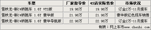 記者從北京地區(qū)進(jìn)口雪鐵龍經(jīng)銷(xiāo)商處了解到,目前剛上市的C4轎跑車(chē)已經(jīng)有展車(chē)到店,并只有售價(jià)21.98萬(wàn)元的一款車(chē)型可以現(xiàn)車(chē)銷(xiāo)售,而且只有紅色一款車(chē)型,提車(chē)不需要加錢(qián)。其余兩款車(chē)型均需要提前預(yù)定,訂金為2萬(wàn)元,車(chē)主最早可以在11月份提到現(xiàn)車(chē)。