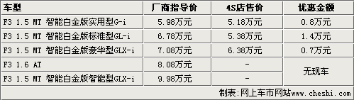 據(jù)比亞迪汽車4S店銷售人員介紹,目前比亞迪F3智能白金版只有實(shí)用性、標(biāo)準(zhǔn)型和豪華型有現(xiàn)車銷售,智能型和自動擋車型都沒有現(xiàn)車,及時預(yù)訂也無法得知具體到店時間,F(xiàn)在購買比亞迪F3智能白金版可以有較大的優(yōu)惠幅度,其中實(shí)用型優(yōu)惠8000元;豪華型可以優(yōu)惠7000元;而標(biāo)準(zhǔn)型最高則可以優(yōu)惠1.4萬元。該比亞迪4S店銷售人員表示,如果到店詳談,還可以有更多的優(yōu)惠幅度。