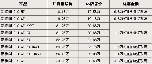 據(jù)廣州本田北京地區(qū)4S店銷售人員介紹,現(xiàn)購買新雅閣均有6千-3.5萬不等的優(yōu)惠,最低售價17.58萬,另贈送“車行無憂”加強防盜系統(tǒng),例如您的車被拖走也會第一時間知道。3.5AT頂級型目前現(xiàn)車較少,則需要預(yù)定。