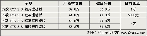 據(jù)4S店銷售人員介紹:目前在售的凱迪拉克09款CTS共有2.8L和3.6L兩個排量車型。這4款車型中,3.6升車型優(yōu)惠幅度較大,2款車可優(yōu)惠4萬元;而2.8升車型優(yōu)惠較少,豪華運動版僅優(yōu)惠5000元。目前3.6升車型為數(shù)不多,喜歡的朋友請盡快與店內(nèi)聯(lián)系。顏色方面,2.8升精英運動版車型有白色、銀色、金色,2.8升豪華運動版有紅色車型,3.6升車型有紅色、灰色車型。另外,年底或明年初將上市新款凱迪拉克CTS,并配備3.0升直噴發(fā)動機,對此車感興趣的朋友請隨時關(guān)注。