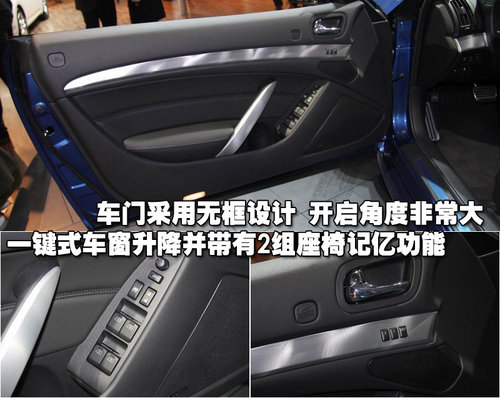 G37敞篷版采用了跑車流行的無框式設計,車門的開啟角度非常大,極大方便了上下車。同時駕駛門集合了一鍵式車窗升降以及電動后視鏡調(diào)節(jié)。并帶有兩組座椅記憶功能。