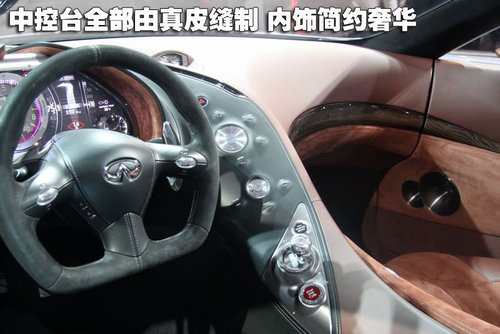 內(nèi)飾設(shè)計(jì)由英菲尼迪和奢侈品牌LV聯(lián)合完成,風(fēng)格抽象,采用顛覆傳統(tǒng)的不對(duì)稱式設(shè)計(jì),黑色駕駛席與紅色客席對(duì)比鮮明,中控臺(tái)完全集中在駕駛席一側(cè)。內(nèi)飾材質(zhì)以真皮和實(shí)木為主,并用大量鋁制配件點(diǎn)綴,突顯運(yùn)動(dòng)氣質(zhì)。