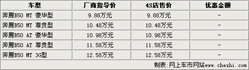 據(jù)一汽奔騰4S店銷售人員介紹,奔騰B50目前的銷售情況非常好,但現(xiàn)在所有車型顏色均不是很全,部分顏色仍需要預(yù)訂。消費(fèi)者如果預(yù)訂奔騰B50,需要交付1000元訂金,而且B50自上市起到現(xiàn)在一直沒有任何優(yōu)惠活動。而3G版車型則一直處于無車的狀態(tài),還請消費(fèi)者諒解。