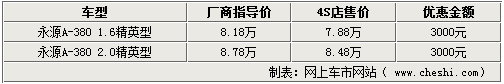 永源汽車(chē)旗下的A-380車(chē)型在經(jīng)銷(xiāo)商處現(xiàn)可給出3000元的現(xiàn)金優(yōu)惠。經(jīng)銷(xiāo)商表示,現(xiàn)在店內(nèi)的1.6L及2.0L車(chē)型均可滿足消費(fèi)者購(gòu)車(chē)的需要,顏色也比較齊全。