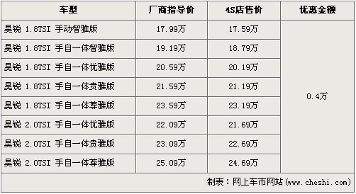 據(jù)北京斯柯達(dá)經(jīng)銷店銷售人員介紹,斯柯達(dá)昊銳共分為8個(gè)車型,售價(jià)區(qū)間為17.99-25.09萬元。目前店內(nèi)昊銳全系有4000元的現(xiàn)金優(yōu)惠,經(jīng)優(yōu)惠后,昊銳的售價(jià)區(qū)間降為了17.59萬-24.69萬,并且店內(nèi)的昊銳現(xiàn)車比較充足,消費(fèi)者挑選的空間也較大。