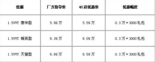 車天下編輯近日從長(zhǎng)城汽車獲悉,憑借歐盟認(rèn)證的金字招牌,長(zhǎng)城炫麗銷量再創(chuàng)新高,11月銷量高達(dá)7000臺(tái)。為了在歲末銷售旺季到來(lái)時(shí)擴(kuò)大戰(zhàn)果,在炫麗上市一周年之際,對(duì)炫麗全系車型實(shí)行最高6000元的大幅優(yōu)惠。具體優(yōu)惠幅度如下:1.5L車型優(yōu)惠幅度擴(kuò)大到6000元,其中包含3000元現(xiàn)金和價(jià)值3000元的超值大禮包。