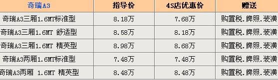 全新的2010款奇瑞A3于近日正式上市,全系均添加了ESP并在內(nèi)外裝飾上有了更多的亮點(diǎn)。筆者從奇瑞汽車經(jīng)銷商了解到,2010款A(yù)3目前現(xiàn)車很少,現(xiàn)在預(yù)訂要等到明年1月初提車,目前價(jià)格上沒有優(yōu)惠。不過店內(nèi)還有部分老款庫存車型,其中三廂車型在享受最高5000元優(yōu)惠的同時(shí)還可贈(zèng)送多重優(yōu)惠,包括送全額購置稅,價(jià)值3000元左右的外牌以及國(guó)產(chǎn)全車貼膜、倒車?yán)走_(dá)裝潢等等,禮包實(shí)惠價(jià)值超過了8000元。