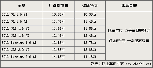 據(jù)東風(fēng)悅達起亞4S店銷售人員介紹:起亞SOUL現(xiàn)車已陸續(xù)到店,目前現(xiàn)車比較齊全,部分款色需要預(yù)訂,需要繳納訂金5000元,一周左右可以提到車,目前SOUL剛剛上市,無任何優(yōu)惠活動。北京地區(qū)各4S店由于訂單不同,各店銷售的現(xiàn)車顏色有所不同。