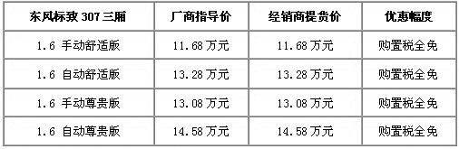 年末將至,一些本已訂車的“訂車族”們,現(xiàn)已成為“催車族”,因為明年的政策將大有不同。近日,車天下編輯從云南都市車迷寶獅店獲悉,目前購307 1.6L全系車型均可享受購置稅全免政策,而且即買即提,享受現(xiàn)車樂趣。具體車型及詳細優(yōu)惠政策,如下表: