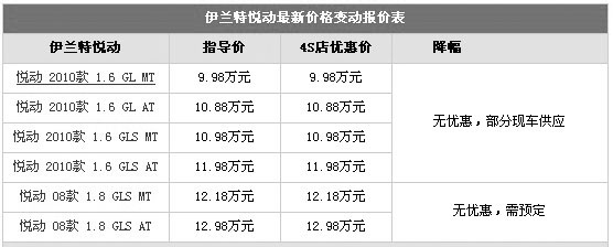 2010款悅動目前僅推出1.6一種排量4款車型在售。GL版配備了ABS/EBD和前排雙安全氣囊等安全裝置,同時標(biāo)配電動車窗、后視鏡電動調(diào)節(jié)和單碟CD等配置。GLS版則在舒適版的基礎(chǔ)上增加了電動天窗和多功能方向盤等配置,并對輪胎進(jìn)行了升級。