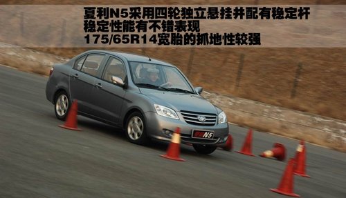 這項(xiàng)測試也可稱之為“麋鹿測試”,可以檢驗(yàn)車輛回避障礙的能力。對于我們進(jìn)行測試的車輛來說,60km/h的通過速度基本已經(jīng)達(dá)到極限。夏利N5采用四輪獨(dú)立懸掛,能夠提供有效的后段支撐力,并且配備了穩(wěn)定桿,能夠使車輛保持在穩(wěn)定的行駛路線。另外,夏利N5配備175/65R14的寬胎,緊急并線時(shí)表現(xiàn)的抓地力也非常不錯(cuò)。