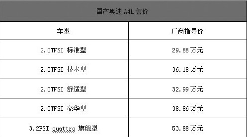 2009年1月5日,一汽-大眾在海南省三亞市正式宣布其開始在國內(nèi)銷售奧迪A4L,這是第8代奧迪A4的國內(nèi)版本。新的奧迪A4L在今天共有裝備2款發(fā)動機的5款車型銷售,官方指導(dǎo)價格從29.88到53.88萬元,相信在一段時期內(nèi),國內(nèi)消費者在全國各大奧迪4S店購買A4L的時候都會執(zhí)行這個售價。