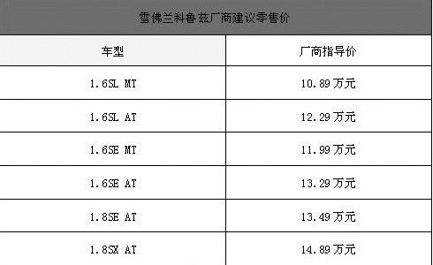 2009年4月9日,上海通用汽車公布了倍受關注的新生代性能中級車雪佛蘭科魯茲的售價。雪佛蘭科魯茲此次共有1.6L和1.8L兩款排量六種不同配置的車型,配備五速手動和S6六速手自一體變速箱,并有六種車身顏色可供選擇,最終價格區(qū)間定為10.89-14.89萬元。即日起全國各地的雪佛蘭經(jīng)銷商店開始接受預訂。