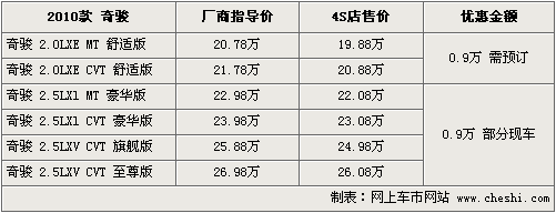 奇駿2010款全車系音響系統(tǒng)升級為數碼6碟高保真劇院CD+Audio音響系統(tǒng),并新增了一款奇駿至尊版,擁有車身包圍套裝、5.8英寸彩色觸摸顯示屏、智能語音導航系統(tǒng)、高保真劇院音響系統(tǒng)、側可視系統(tǒng)、倒車影像監(jiān)視系統(tǒng)、可伸縮行李廂遮物簾等七大亮點配置。在銀色、黑色等顏色的基礎上,奇駿2010款還增加了瑪瑙紅車色,更顯時尚、動感。
