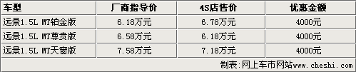 據(jù)吉利汽車4S店銷售人員介紹,現(xiàn)在遠(yuǎn)景1.5L車型不是很齊全,天窗版沒有現(xiàn)車需要預(yù)訂。元旦之前,遠(yuǎn)景1.5L車型全系可以優(yōu)惠5000元,但目前這款車型只能優(yōu)惠4000元。不過銷售人員表示,如果到店購車,除了有4000元現(xiàn)金優(yōu)惠以外,還可以贈送全車裝飾。