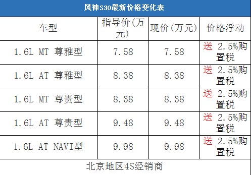 東風(fēng)風(fēng)神S30上市后,價(jià)格一直都比較穩(wěn)定,和競爭對手相比,風(fēng)神S30的價(jià)格優(yōu)勢并不是非常突出,因此市場表現(xiàn)也只能用一般來形容,其12月份不足5000輛的月銷量也從側(cè)面反映了這個(gè)問題。我們近日從北京地區(qū)的一家東風(fēng)風(fēng)神汽車4S經(jīng)銷商處了解到,目前該店正在舉行購車送2.5%購置稅的活動(dòng),相當(dāng)于有1500元以上的現(xiàn)金優(yōu)惠。以下是風(fēng)神S30全系車型最新報(bào)價(jià)表: