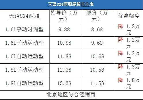 近日,編輯從北京地區(qū)長安鈴木綜合經(jīng)銷商處了解到,天語SX4兩廂有黑色和紅色現(xiàn)車,目前購車最高有1.8萬元的現(xiàn)金優(yōu)惠,并且贈送汽車裝飾,性價比非常不錯。據(jù)經(jīng)銷商透露,消費者想要以這個價格提車,需要在店內(nèi)做一條龍服務(wù),其中車輛四項基本保險可以打8.5折(約合3500-4100元左右)。以下是天語SX4最新價格變化表: