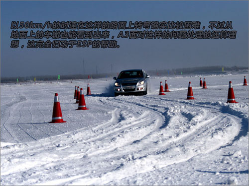 在雪地上行駛,過于光滑的路面是最大的安全隱患,幾乎為零的摩擦力使得四個輪子幾乎抓不住地面。在專業(yè)教練的陪同下,我們首先在開啟ESP功能的情況下的行駛中躲避障礙物的體驗。以預定車速進入車道后將車輛加速至50-60km/h,向左躲避面前的一個裝桶,第一個緊急變線時,(將方向盤的向左的轉(zhuǎn)向角度故意打的比常態(tài)更大一些,目的是為了讓車底的轉(zhuǎn)向傳感器有更明顯的認知,從而引導ESP更好的工作。)在車內(nèi)可以比較明顯的感覺到ESP為了糾正車輛即將出現(xiàn)的轉(zhuǎn)向不足的問題給車輛的左后輪施加了制動力,從而使車輛比較順利的換到了旁邊的車道內(nèi)。在這之后趕緊回正方向,ESP為了糾正車輛有可能出現(xiàn)的轉(zhuǎn)向過度的問題又給左前輪施加了制動力,從而使得車輛平穩(wěn)的留在了障礙物左側(cè)的車道內(nèi)。