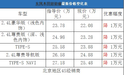 近日,編輯從北京地區(qū)東風(fēng)本田4S經(jīng)銷商處了解到,目前思鉑睿在店內(nèi)有少量現(xiàn)車,購車全系可以優(yōu)惠1萬元現(xiàn)金。以下是思鉑睿最新價格變化表: