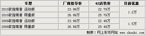 據(jù)4S店銷售人員介紹:指南者目前共有2009款及2010款車型,分別為運(yùn)動(dòng)版及限量版總共4款。09款車型現(xiàn)車顏色為黑色及綠色,全系優(yōu)惠1.5萬(wàn)元;2010款車型有黑色、綠色、紅色,最高優(yōu)惠1.2萬(wàn)元。目前老款及新款優(yōu)惠價(jià)格相對(duì)較高,如果到店洽談會(huì)有簡(jiǎn)單裝飾贈(zèng)送。09款指南者優(yōu)惠后最低僅售22.49萬(wàn)元,凸顯性價(jià)比。