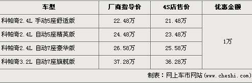 科帕奇車型分為2.4L與3.2L兩種排量,2.4L手動五座舒適版和2.4L七座手自一體豪華版兩款車型先期上市,2.4L 5座精英版和3.2L排量的車型隨后也上市銷售,全車系售價區(qū)間為22.48萬元-37.28萬元。近期根據網上車市價格監(jiān)測顯示,科帕奇2.4L車型全系優(yōu)惠1萬元,具體詳情請看下表: