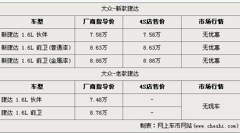 據(jù)北京一汽大眾經(jīng)銷店銷售人員介紹,大眾全新捷達(dá)1.6L分為伙伴版以及前衛(wèi)版兩種車型,售價(jià)分別為7.58萬(wàn)元和8.88萬(wàn)元,由于前衛(wèi)版白色車型采用的是普通漆油料,所以在廠商指導(dǎo)價(jià)方面會(huì)比前衛(wèi)版其他顏色車型便宜2500元,售價(jià)為8.63萬(wàn)元。銷售人員還介紹,老款的大眾捷達(dá)已經(jīng)沒有現(xiàn)車,消費(fèi)者已經(jīng)無(wú)法購(gòu)買到。