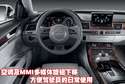 在內(nèi)飾方面,大燈開(kāi)關(guān)、外后視鏡調(diào)節(jié)旋鈕以及電子手剎等大量鍍鉻飾件的應(yīng)用,不僅提升視覺(jué)效果的同時(shí),也進(jìn)一步提升了整車(chē)的檔次。此外,中控臺(tái)上的空調(diào)及MMI多媒體影音系統(tǒng)旋鈕均被下移,并與中空臺(tái)形成一定的角度,方便駕駛員的日常使用。