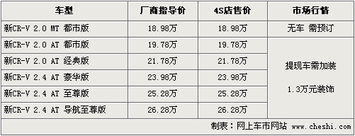 3月5日東風本田正式推出全新的CR-V,分為2.0L及2.4L兩種排量,共計六款車型,售價18.98萬元-26.28萬元,比老款增加了導航版車型,新CR-V在配置方面更加完善。根據(jù)網(wǎng)上車市價格監(jiān)測系統(tǒng)顯示,全新上市的CR-V目前加價數(shù)額與3月基本相同,提現(xiàn)車需加裝1.3萬元裝飾。具體車型售價見下表: