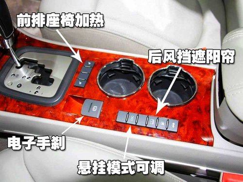 在換擋桿后部的控制區(qū)應(yīng)該說是瑞麒G6前排的亮點(diǎn)所在,首先電子手剎出現(xiàn)在G6上,座椅加熱這一冬天的貼心裝備也在這個(gè)位置,除此之外,瑞麒G6還帶有懸架調(diào)節(jié)控制,有三種模式供給駕駛員選擇,同時(shí)商務(wù)車裝備的后窗遮陽簾也是標(biāo)配。