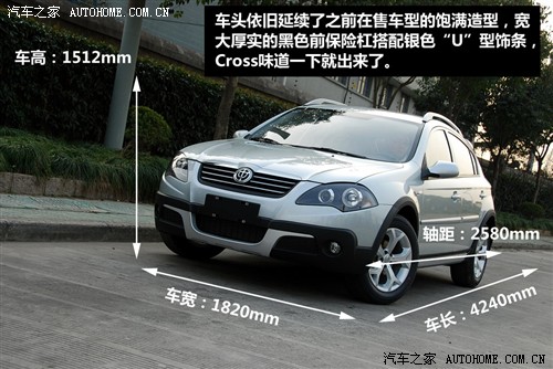 駿捷Cross的車身尺寸為4240mm×1820mm×1512mm,軸距依然為2580mm,與原型車駿捷FRV相比,除了底盤升高了20mm之外,中華駿捷Cross加裝了前后大包圍,標(biāo)配的全鋁制車頂行李架和蜂窩狀的進(jìn)氣格柵增加了動感和活力,輪轂由FRV的15寸升級為16寸的鋁合金輪轂,在增強視覺效果的同時,也使檔次得到一定提高。