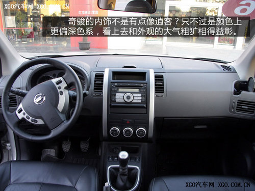 奇駿的內(nèi)飾設(shè)計(jì)與逍客有不少相似之處,只是為了迎合硬朗的外形,車內(nèi)使用了深色系的顏色搭配,并在細(xì)節(jié)設(shè)計(jì)上更多的選擇了方形,看上去更簡(jiǎn)潔大氣。而且在用料做工上,也比CR-V要厚道一些。
