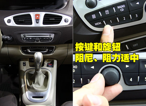 雷諾新風景的中控臺面板屬于時尚、簡潔的類型。中控臺的各按鍵、旋鈕在使用中各項調(diào)節(jié)功均能準確到位,音響控制面板按鍵大小適中,方便乘客操作。