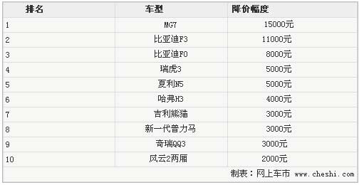 隨著國(guó)內(nèi)汽車市場(chǎng)逐漸升溫,很多汽車品牌也開始了市場(chǎng)爭(zhēng)奪戰(zhàn),很多熱門車型在進(jìn)入五月份以來,都出現(xiàn)了較大的優(yōu)惠幅度。據(jù)網(wǎng)上車市網(wǎng)站了解,很多自主品牌熱門車型在北京汽車市場(chǎng)已經(jīng)開始出現(xiàn)了初步的價(jià)格戰(zhàn),比如比亞迪F3、MG7等熱門車型都出現(xiàn)了萬元以上的優(yōu)惠幅度。這對(duì)很多消費(fèi)者來說算是個(gè)比較好的消息,接下來讓我們?nèi)チ私庖幌戮烤褂心男┸囆蛢?yōu)惠幅度最多。