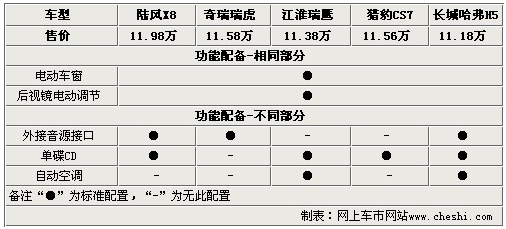 你可以不考慮SUV內(nèi)部的做工是否夠細(xì)致縝密,但是有一些必要的配置還是可以有的。電動車窗和后視鏡電動調(diào)節(jié)兩項(xiàng)增加使用便利性的配置5款車全部配備。在影音娛樂方面,瑞虎更趨向于現(xiàn)代娛樂方式-外接接口,而瑞鷹和CS7則更青睞于傳統(tǒng)高音質(zhì)載體-CD播放器,而X8和H5則集合了新老兩代播放方式,值得加分。